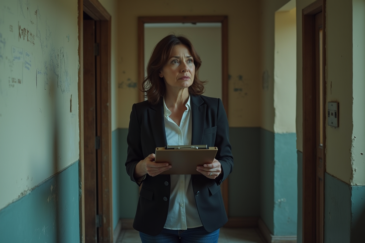 Femme d'âge moyen dans un couloir délabré d'un appartement abandonné